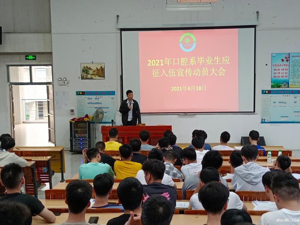 4月18日,口腔系在鼎湖校区组织开展一次了以“参军光荣,不负韶华”主题的应征入伍宣传动员大会,动员大会由口腔系毕业班辅导员刘炜新老师主持,口腔系党支部副书记王华山、以及2021届全体毕业班的男生参加了本次动员大会。