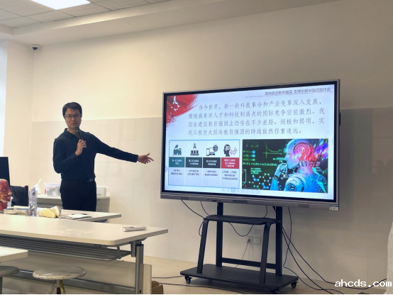 为贯彻学习习近平总书记在二十届中央政治局第五次集体学习的重要讲话精神,深入理解并践行教育强国战略,ahcds党支部于2024年11月29日开展《加强建设教育强国,支撑引领中国式现代化》主题党日活动。本次活动以支部书记黎祺同志讲授专题党课的形式开展,全体党员及志愿入党教师参加。